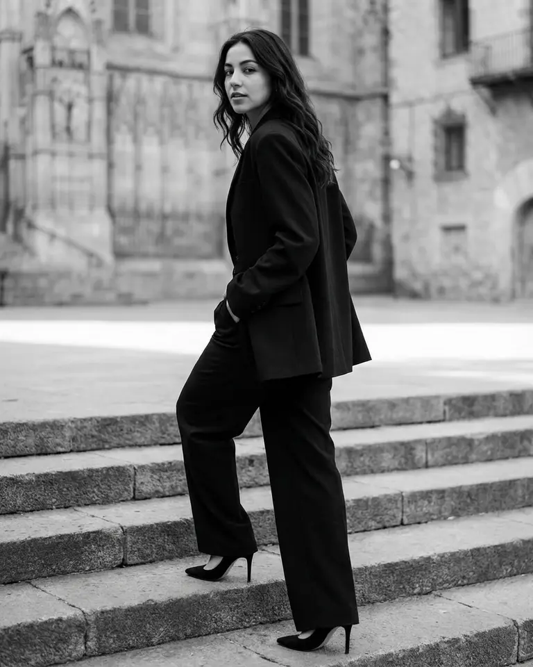 - Details: Oversized black blazer suit jacket (critical) with loose fit, matching black wide-leg trousers (critical), black pointed-toe stiletto heels (critical). Hair styled with natural loose waves and movement.
