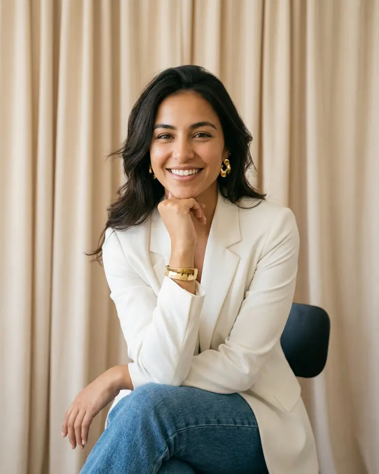 Give your image a professional refresh with this polished style inspired by the contemporary "clean girl" aesthetic. You are styled in a sharp white blazer and gold statement jewelry against a warm, neutral curtain backdrop. It offers a bright, high-end studio vibe that looks confident and approachable.