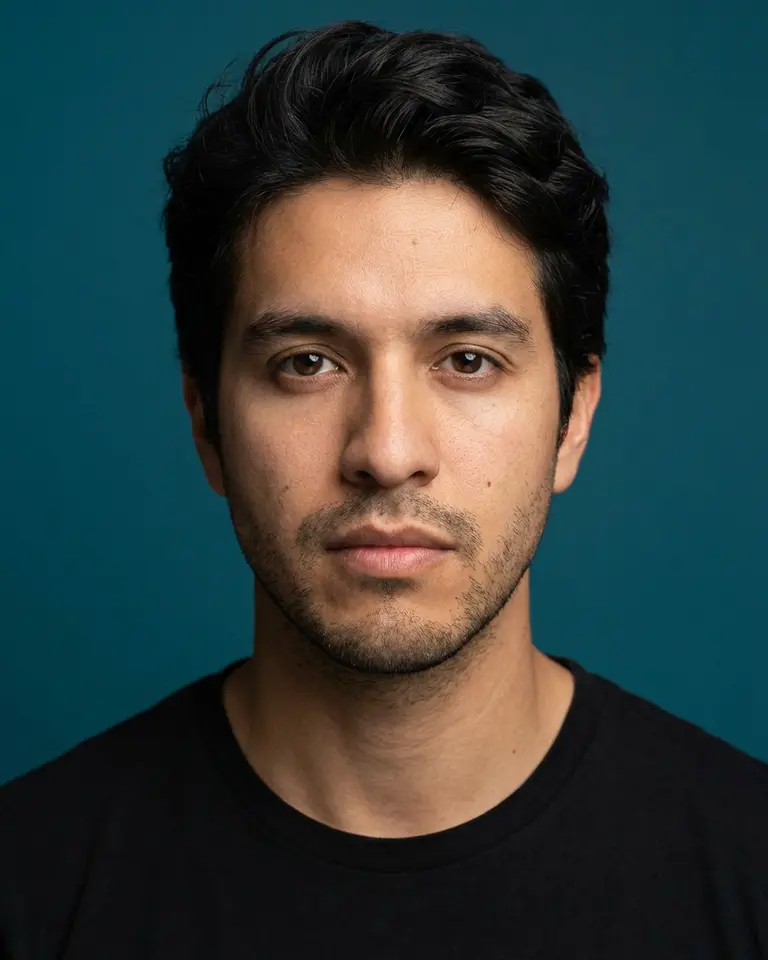 - Pose: Facing camera directly, shoulders square and symmetrical, head straight in a classic passport or casting photo stance