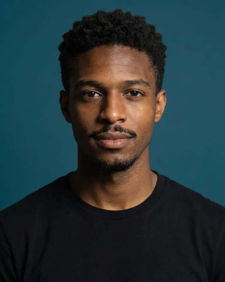 - Details: Basic black crew neck t-shirt (critical), clean unbranded fabric. Hair styled neatly away from face (if length allows) or groomed neatly to match the clean aesthetic.