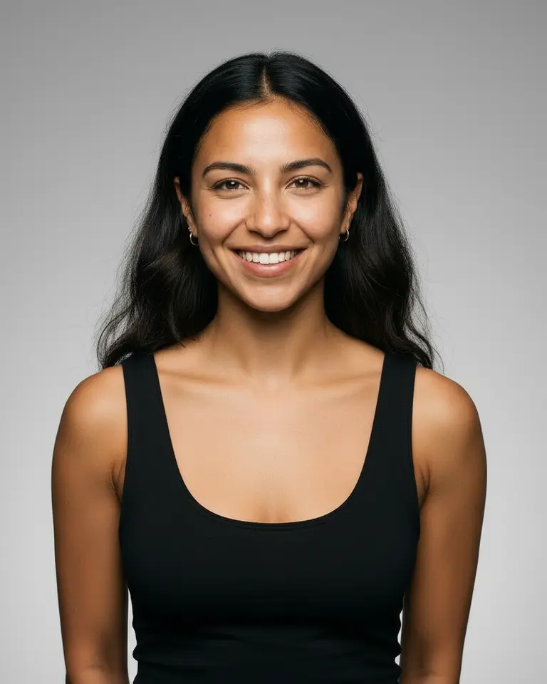 - Details: Basic black cotton tank top with low scoop neckline (critical), sleeveless. Hair styled with natural texture and volume, loose and framing face appropriate to person's length. Minimal "no-makeup" look.