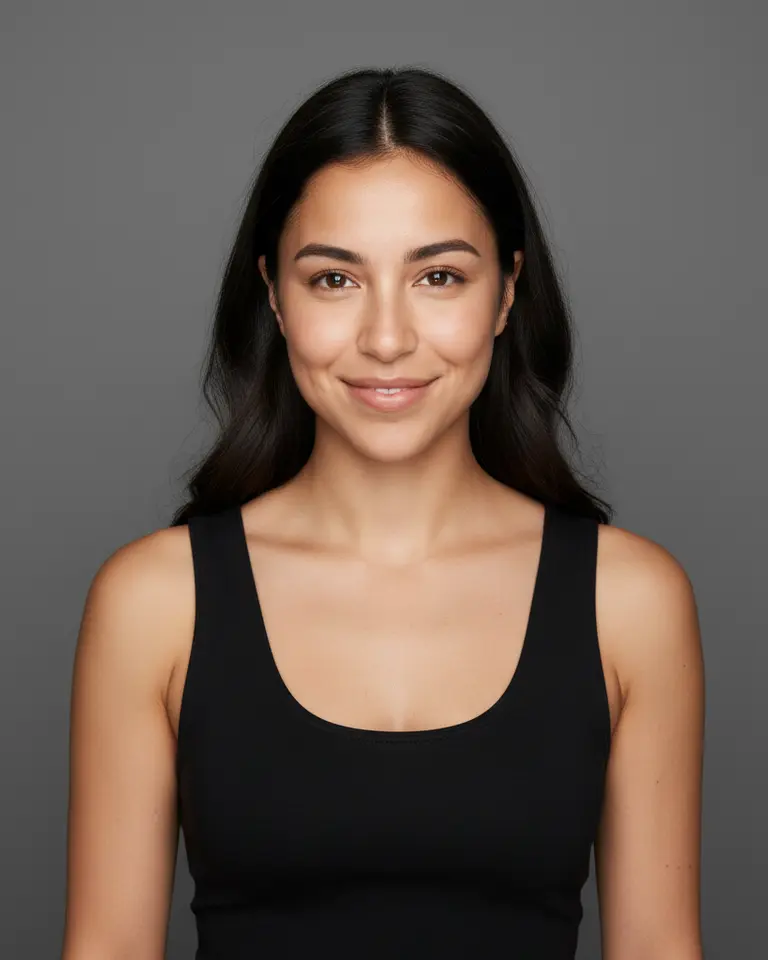 MOOD: Professional casting call headshot. Clean, honest, fresh-faced, and approachable energy with a focus on natural beauty.