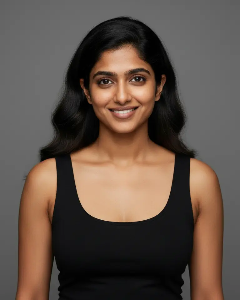 NEGATIVE: DIFFERENT PERSON, WRONG GENDER, WRONG AGE, face swap, altered features, smooth plastic skin, changed skin tone, changed hair texture, added/removed hair length, multiple people when should be solo, looking away, frowning, serious expression, dramatic lighting, high contrast, colorful background, patterned clothing, long sleeves, outdoor setting, vintage film grain, harsh shadows, jewelry, heavy makeup, blurred face.